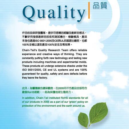 仟岱的品保研發團隊,提供可信賴的經驗及創新的想法,不斷研究發展新的技術和測試機臺、檢驗模具,產品本身也通過 ISO9001:2000 及 CE 和 UL 的認證出廠前,也都全檢以達到產品 安全及零故障。